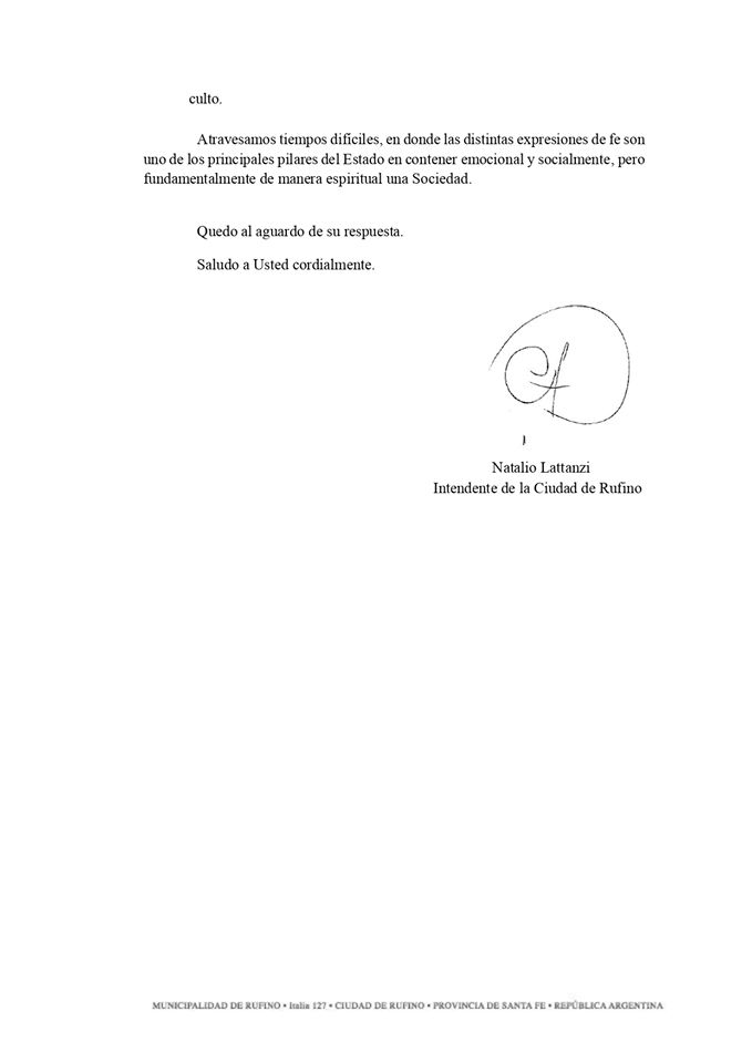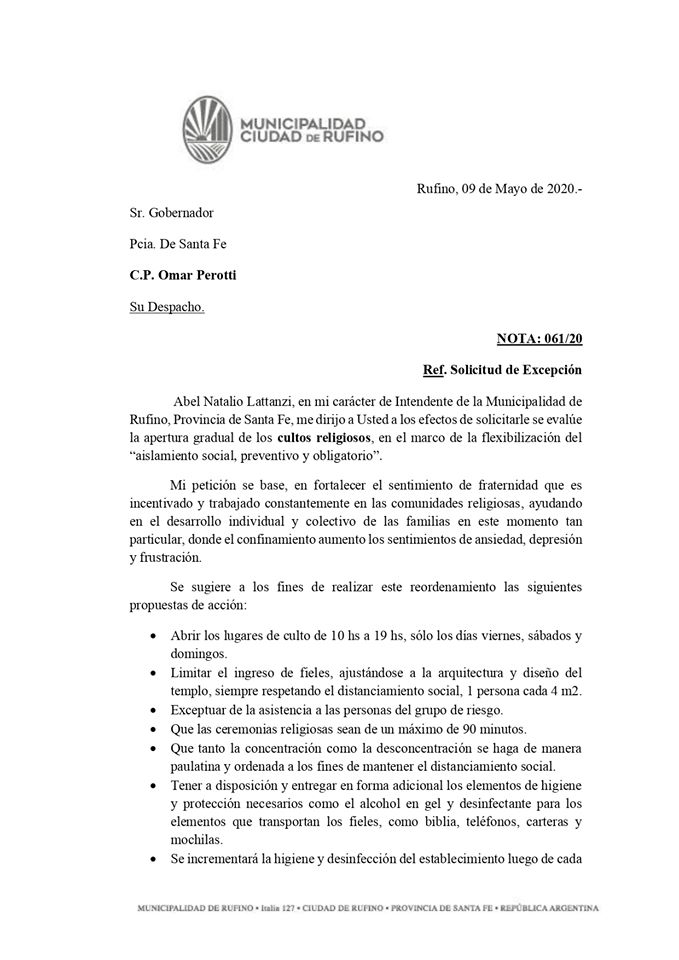 El Intendente Natalio Lattanzi se reunió con representantes de cultos locales y le ha enviado al Gobernador Omar Perotti y al Centro de Operaciones de Emergencia (COE) Departamental, una nota con la propuesta realizada para poder funcionar y contener a la población. El objetivo es que dichos lugares puedan abrir tres veces por semana (viernes, sábado y domingo) y que se tomen todas las medidas necesarias para respetar el distanciamiento social y las normas de salud e higiene.
