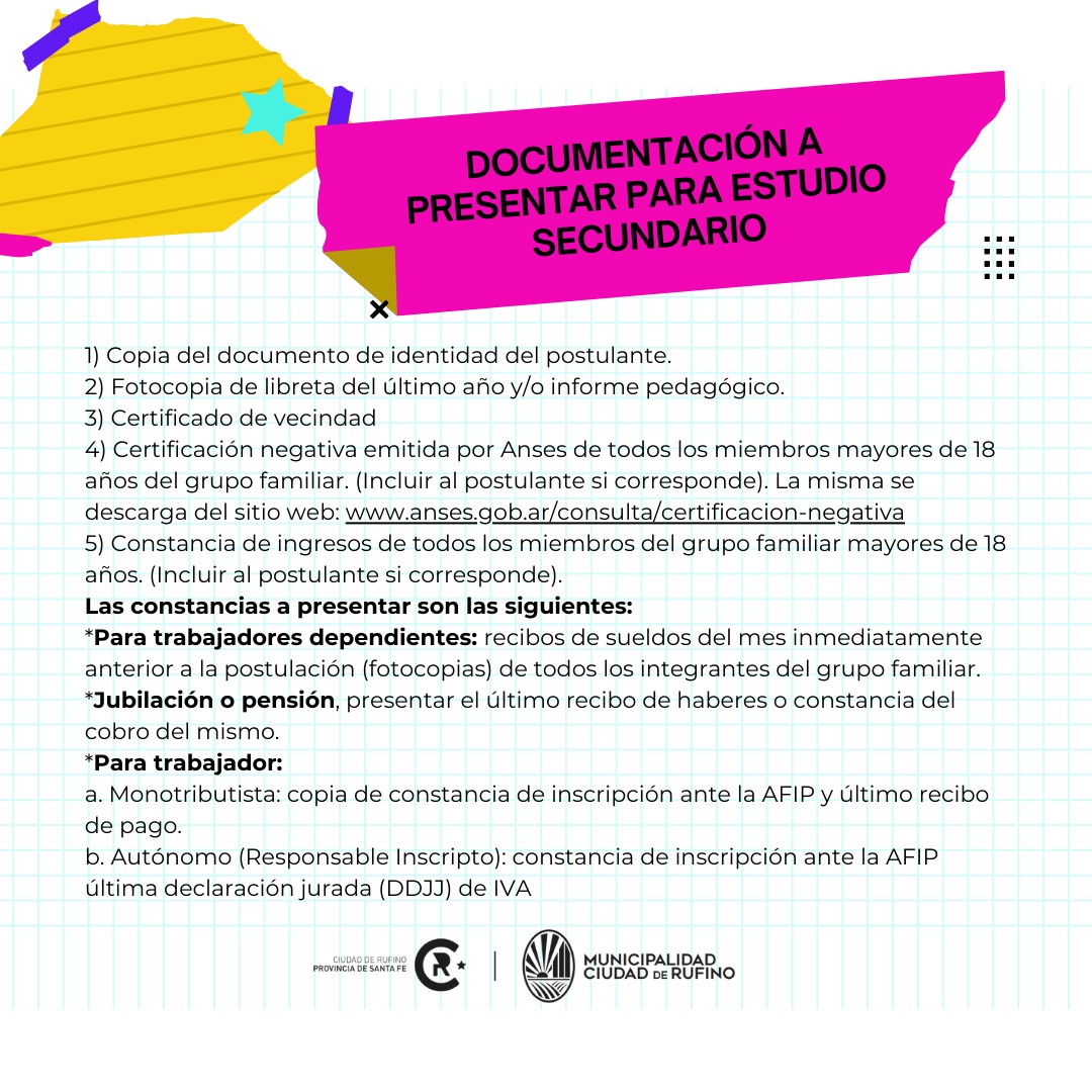 La Municipalidad de Rufino informa que se abre la segunda etapa de inscripciones para las becas destinadas a estudiantes de niveles secundario, terciario y universitario de instituciones públicas y privadas, hasta el 14/02 inclusive. Las mismas se realizan en las oficinas de Desarrollo Social (Bv. Belgrano 220), de lunes a viernes de 9 a 13 horas.